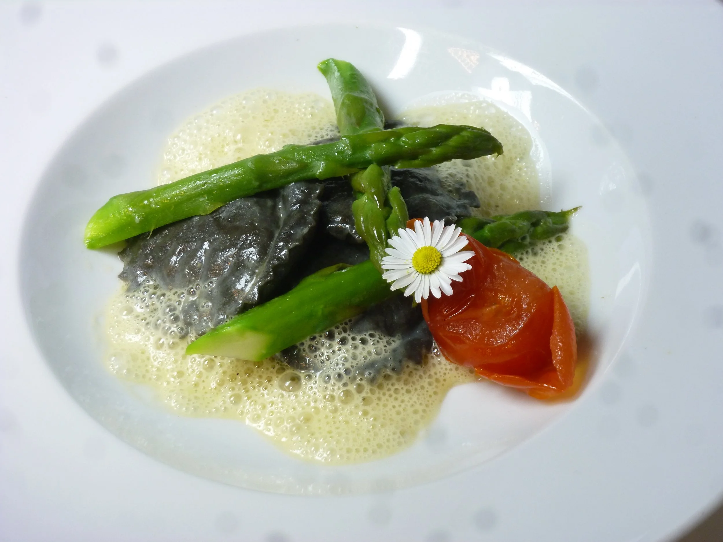 Bunter Spargel mit Hummerbisque, Fjordlachs & Paella Reis